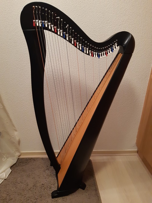Op dit moment heb ik een prachtige harp staan met 34 snaren en haakjes. De harp is 12 jaar jong en ziet er uit als nieuw. Er zitten 34 snaren op. Er zit een bruin haakje op dat nieuw is opgezet omdat de eerdere gebroken was, dit haakje is nieuw en functioneert prima. De afmetingen van de harp zijn 1.29m hoog, 70cm breed, 37cm diep. Bij de harp hoort een bijpassende zeer stevige transporthoes en een stemsleutel. Echt een harp met een mooie klank en uitstraling. De harp is te koop voor €975,- incl. stemsleutel en transporthoes.